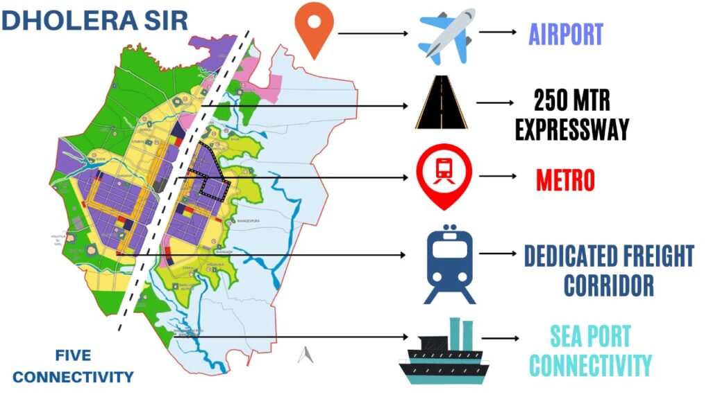 The project features world-class infrastructure across six strategic zones—residential, commercial, industrial, recreational, transport, and utility. With estimated investment of ₹78,000 crores, Dholera aims to become a global manufacturing hub powered by a 5,000 MW solar plant